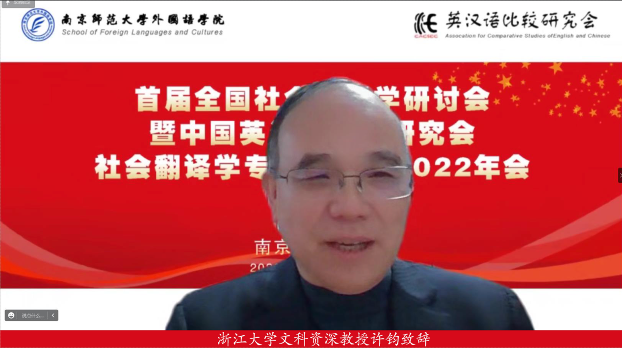 许钧教授在致辞中肯定了翻译学与社会翻译学学科建设的重要性。他指出,社会翻译学研究意义重大、领域广阔且任重道远,未来需加强对重要社会翻译历史的关照、对重要翻译现象的解释和对当下翻译实践的指导。