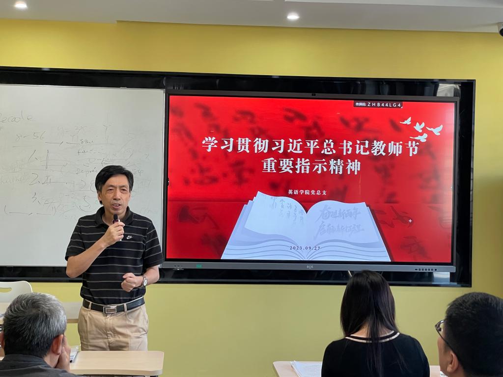 王明欣传达了习近平总书记在第三十九个教师节到来之际给全国优秀教师代表的来信精神。她指出,以教育家为榜样,大力弘扬教育家精神,为建设教育强国、实现民族复兴培养更多德才兼备的高层次外语人才,是时代赋予北外英语学院的使命,更是北外英院人不断坚持的教育理念。英语学院建院八十年来,先后走出了多位享誉国内外的教育家,为新中国外语教育发展做出了突出贡献。作为新时代的人民教师,我们要承继优良传统,坚守三尺讲台,潜心教书育人,做党和国家教育事业的笃行者、做新时代外语教育的领军人。