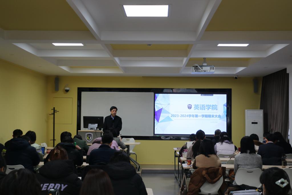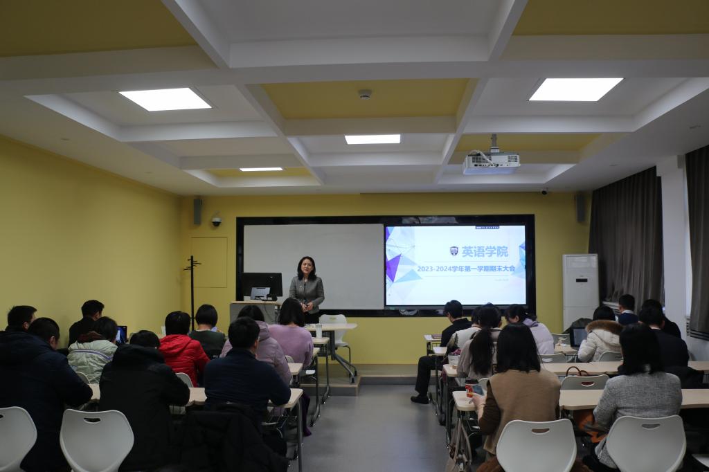 2024年1月8日上午,英语学院召开2023-2024学年第一学期期末教职工大会。会议由党总支书记殷悦主持,全体教职员工参加。