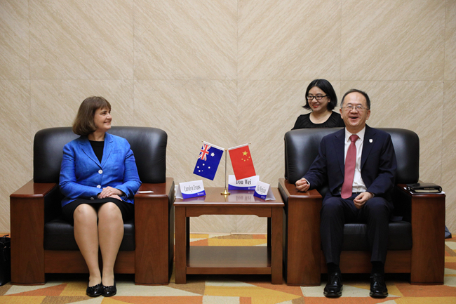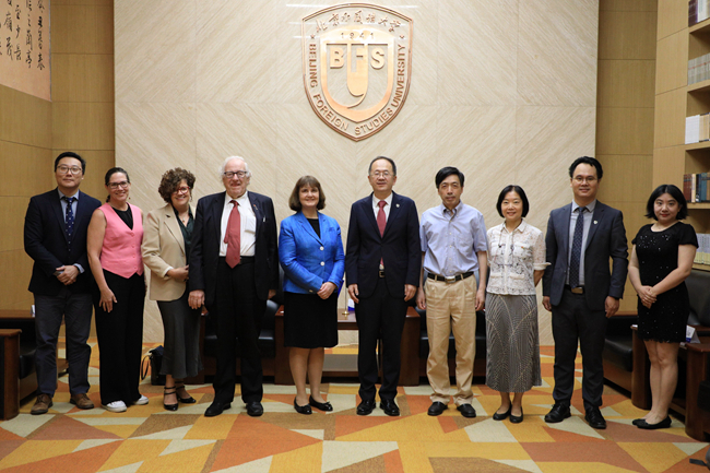 会前,贾文键在图书馆会见埃文斯一行,探讨深化两校交流与合作事宜。张剑,李又文,国际交流与合作处副处长、留学生办公室主任李茂林参加会见。