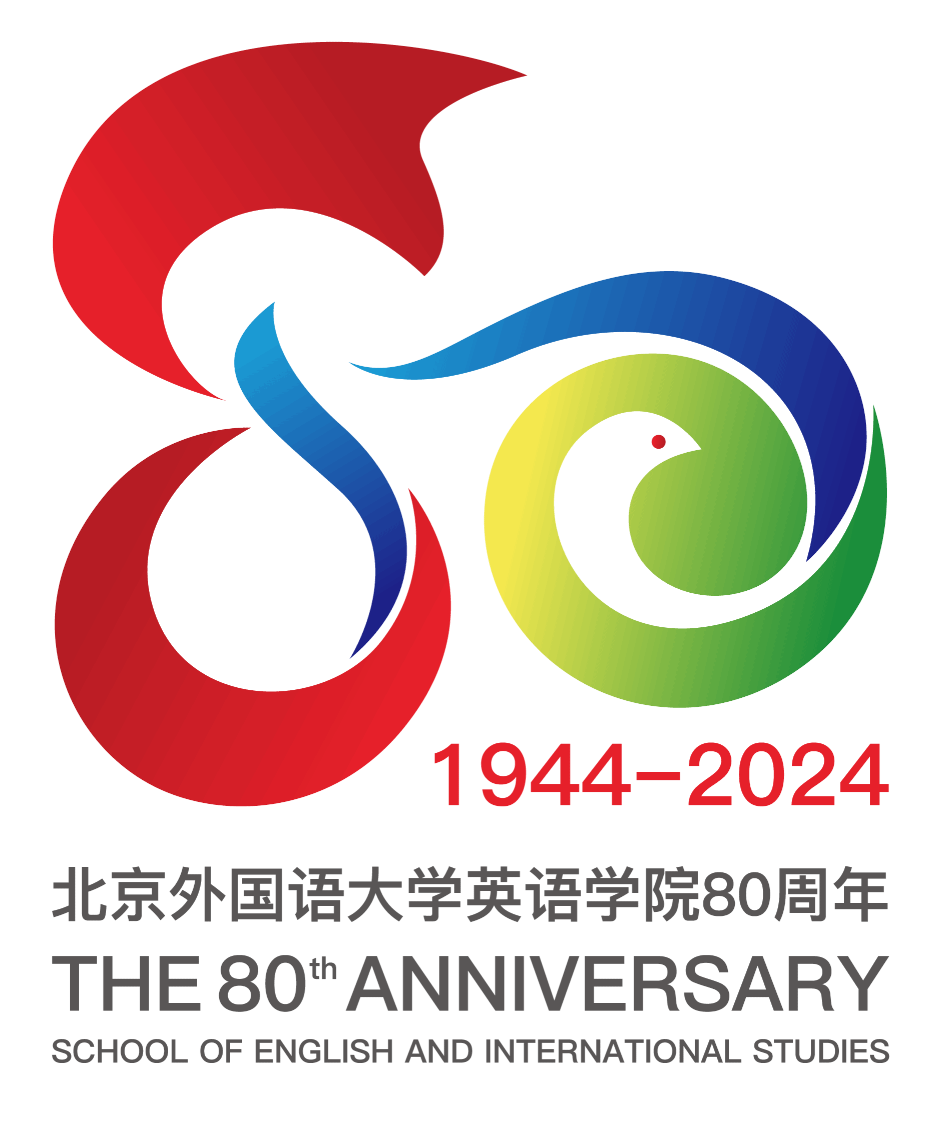 2024年3月,英语学院正式推出80周年院庆LOGO及主视觉标识图案。80周年院庆标识,以“80”为基础造型,融合了舞动的丝带元素,表达了庆祝学院80周年这一主题,也有“载歌载舞、欢聚一堂、共同庆祝”之意。吉祥的和平鸽与地球的巧妙融合,辉映着英语学院专业的多元国际化特色,象征着和平、吉祥、包容、知识和智慧。