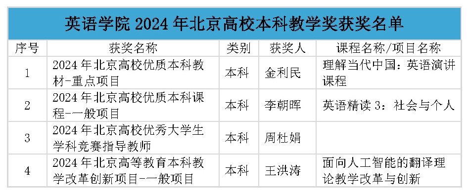 近日,北京市发布《北京市教育委员会关于公布2024年度北京市高等学校教学名师奖获奖名单的通知》等多项教学教材奖获奖名单,北外共有10个奖项、24个团队/个人获奖,其中英语学院共有4位老师获奖。