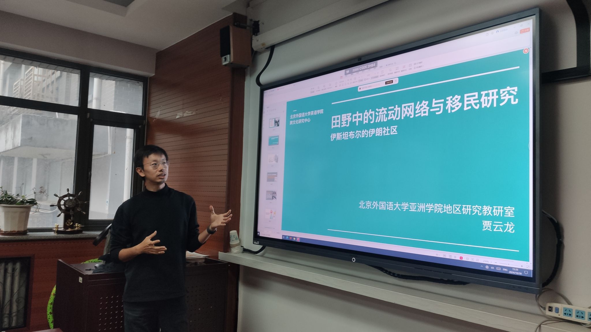 2024年10月30日下午,北京外国语大学亚洲学院地区研究教研室老师贾云龙博士应英语学院跨文化研究中心邀请,做了题为“田野中的流动网络与移民研究:伊斯坦布尔的伊朗社区”的线下学术讲座。讲座由英语学院跨文化研究中心主任刘杨博士主持,英语学院及外系师生共同聆听了本次讲座。