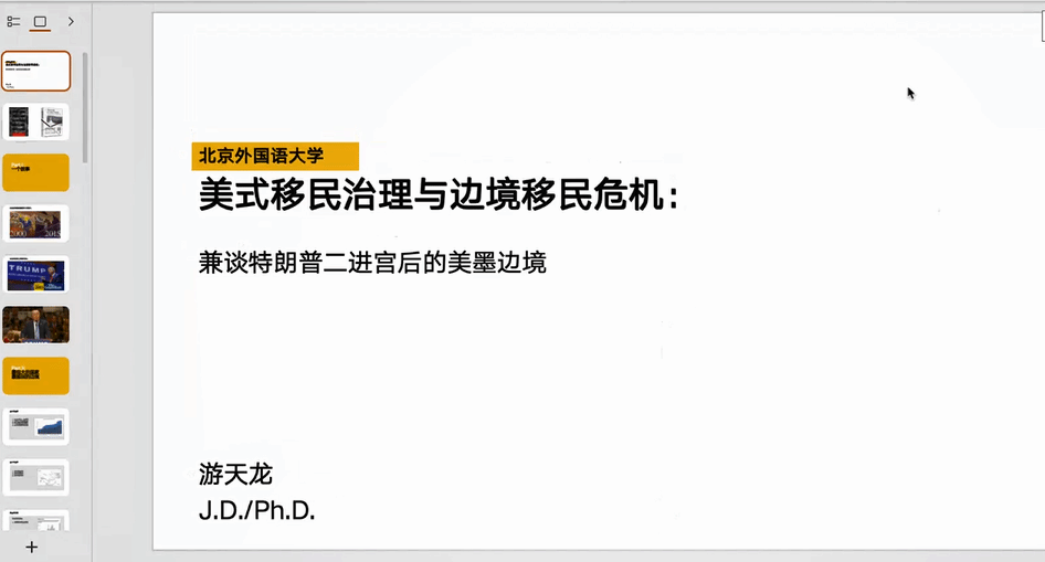 2024年12月6日下午,云南大学社会学系的游天龙博士应英语学院跨文化研究中心之邀,举办了一场题为“美式移民治理与边境移民危机”的线上学术讲座。此次讲座由英语学院跨文化研究中心的刘杨博士主持,吸引了英语学院的师生以及校内外教师和学生积极参与。