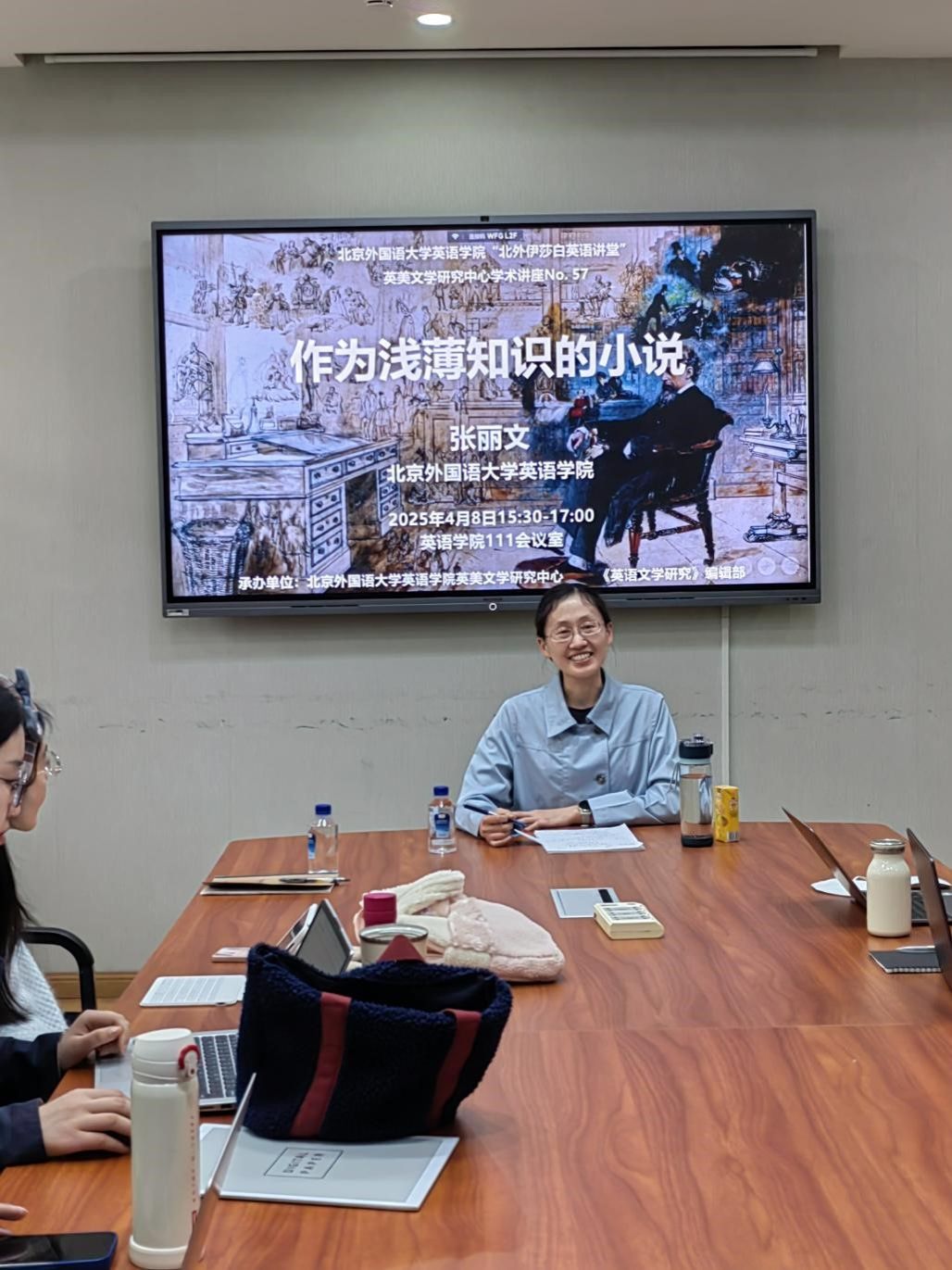 4月8日下午,北京外国语大学英语学院张丽文老师应英美文学研究中心邀请,在学院111会议室为英语学院师生带来了一场题为《作为浅薄知识的小说》的精彩讲座。讲座由英语学院英美文学研究中心主任黄强老师主持,共计四十余人参加。