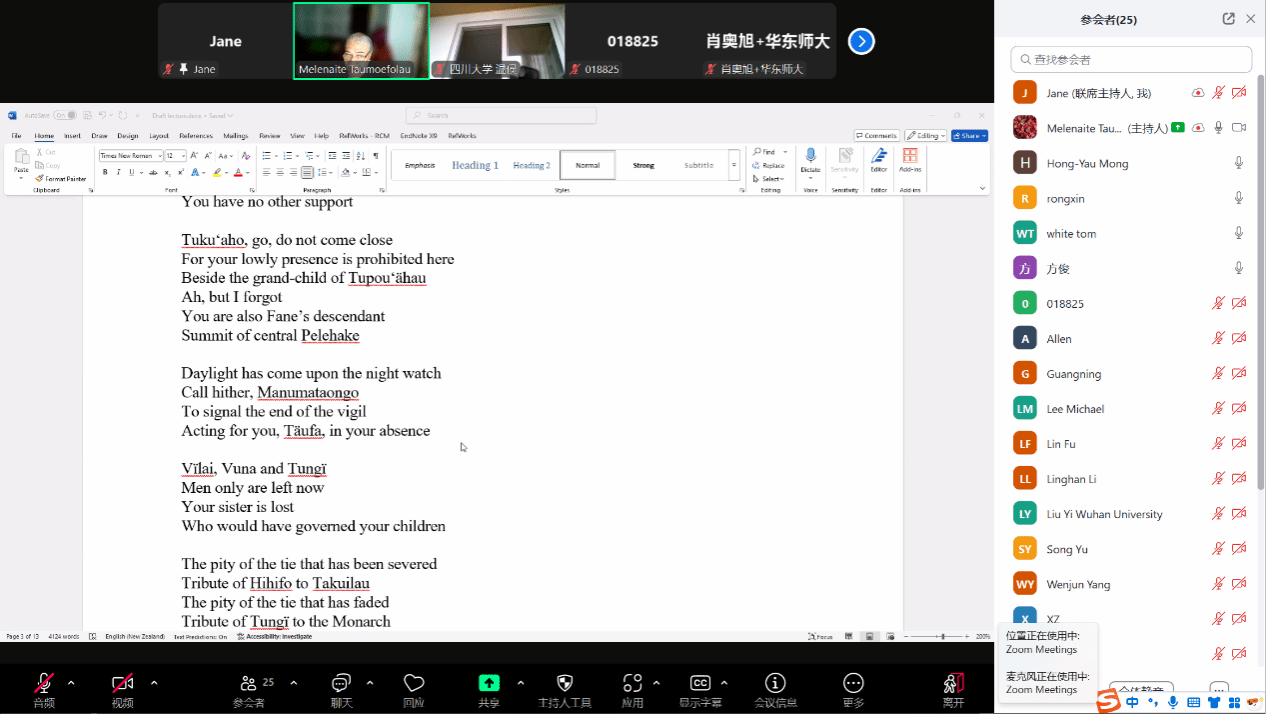 2025年4月29日下午,应北京外国语大学英语学院南太平洋研究中心和世界语言博物馆的邀请,汤加语外国专家梅莱奈伊特·塔乌莫艾富拉乌(Melenaite Taumoefolau)博士在线上做了题为“夏洛特女王诗中的汤加文化”(Tongan Culture in Queen Sālote’s Poems)的讲座。讲座由英语学院教师李菅主持,来自校内外多名师生参加了本场讲座。