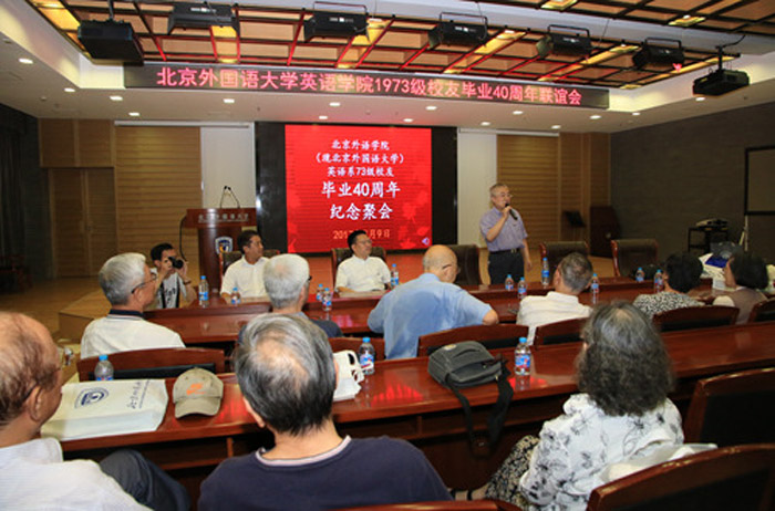 ——2017年 9月9日,我校英语学院1973级校友毕业40周年联谊会在行政楼配楼举行,来自全国和世界各地的近80位校友和包括已102岁高龄的伊莎白教授在内的20多位昔日恩师齐聚母校,忆昔日校园生活,话今日师生情谊,情深意切,场面动人。学校党委书记韩震,副校长袁军,党委副书记、纪委书记胡志钢出席联谊会。联谊会由郭健生校友主持。