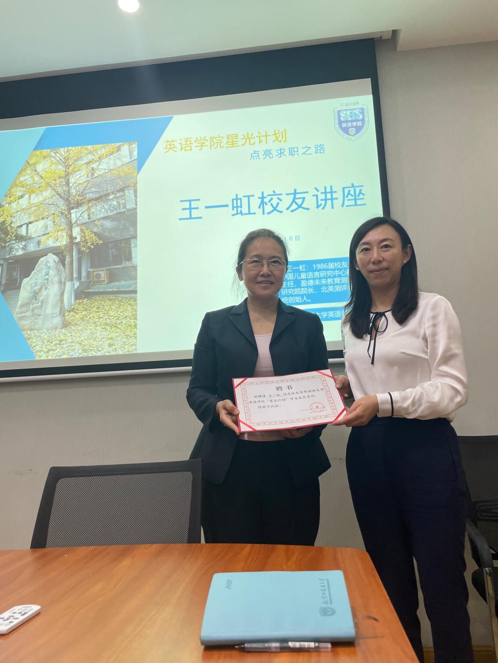 活动最后,王明欣向王一虹颁发英语学院“星光计划”学生成长导师聘书。英语学院“星光计划”,旨在更广泛联络和更多凝聚校友,加强学院与各行各业校友之间、在校学子与校友之间的联系,激活校友资源,充分发挥已毕业校友的知识储备优势和成长阅历优势,助力学院复合型人才培养,推动多元化高质量就业。
