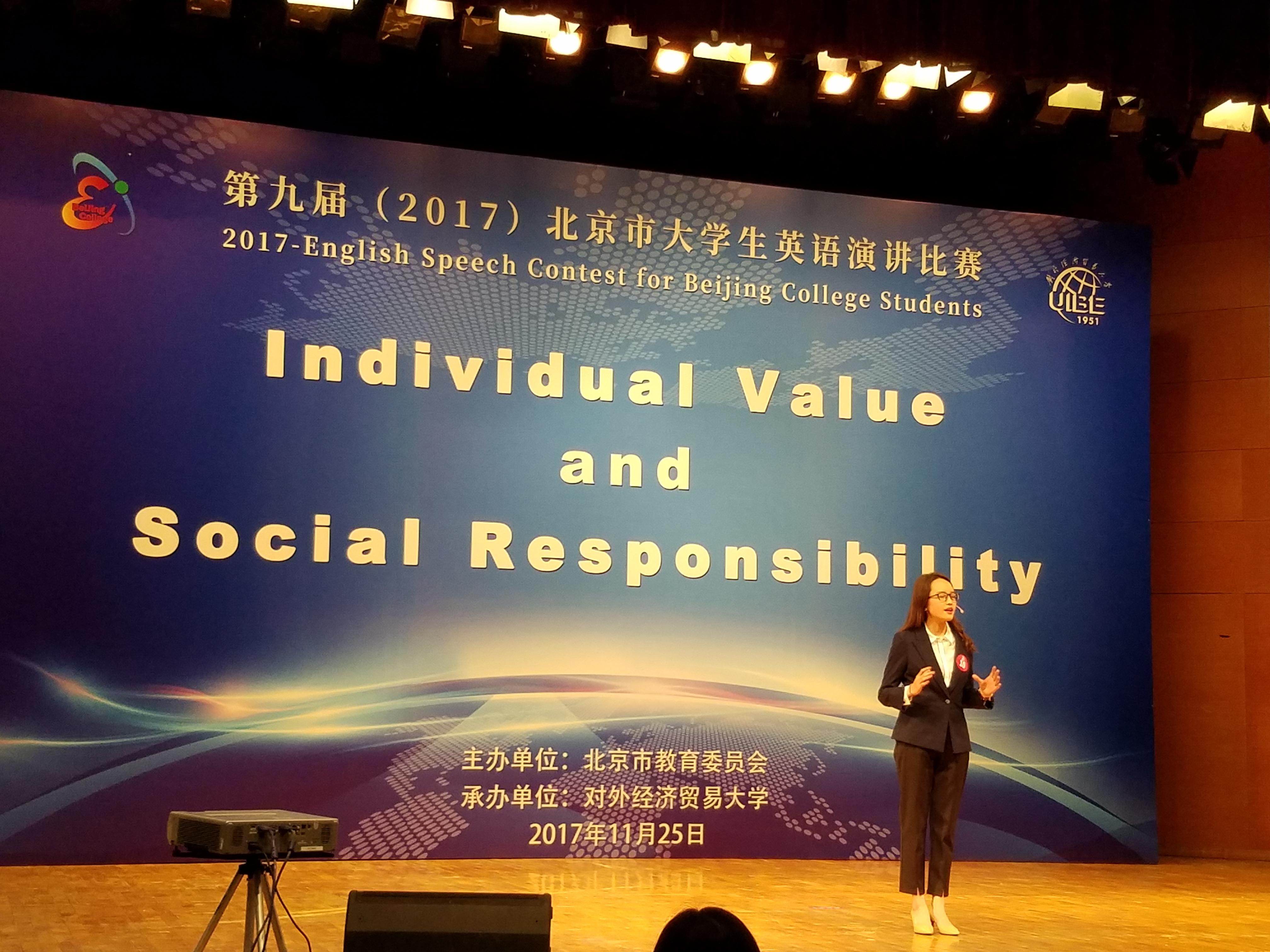 ——11月25日,第九届北京市大学生英语演讲比赛决赛在对外经济贸易大学图书馆报告厅举行。英语学院2016级学生范柳依表现优异,在下午的决赛中以总分第二名获得大赛一等奖。