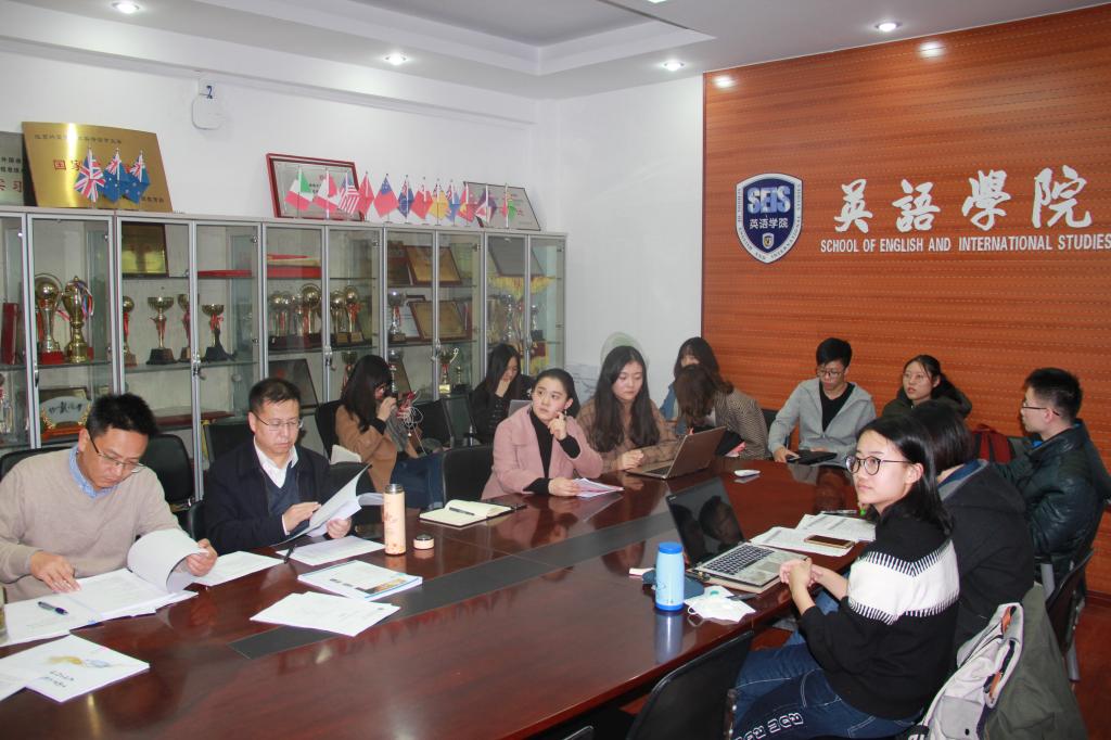 2018年11月14日周三晚,英语学院在115会议室召开2018年“国家级大学生创新创业训练计划”项目中期检查汇报会。党总支书记路兴、副院长谢韬、辅导员于承杰以及14个立项项目负责人参加。