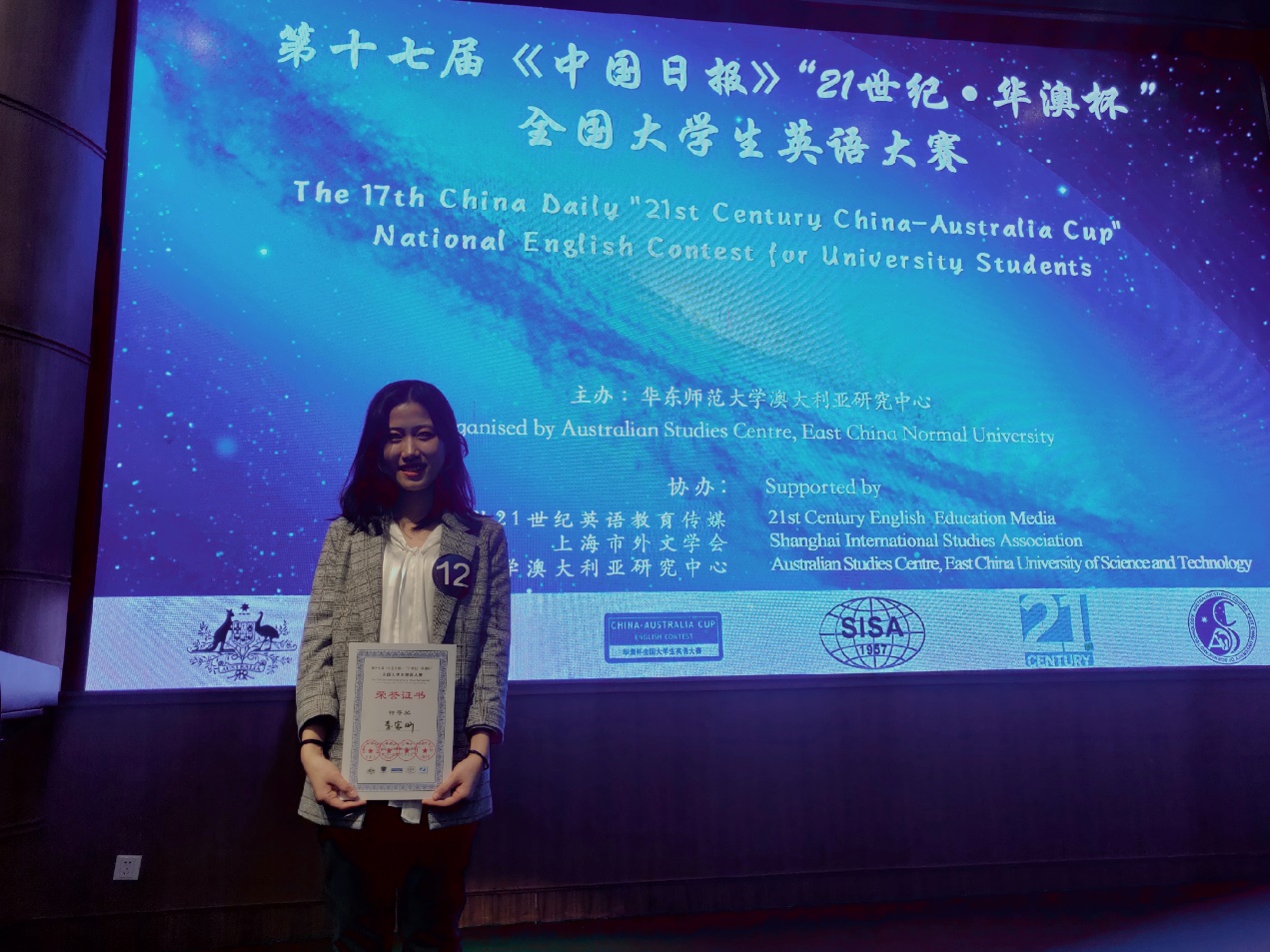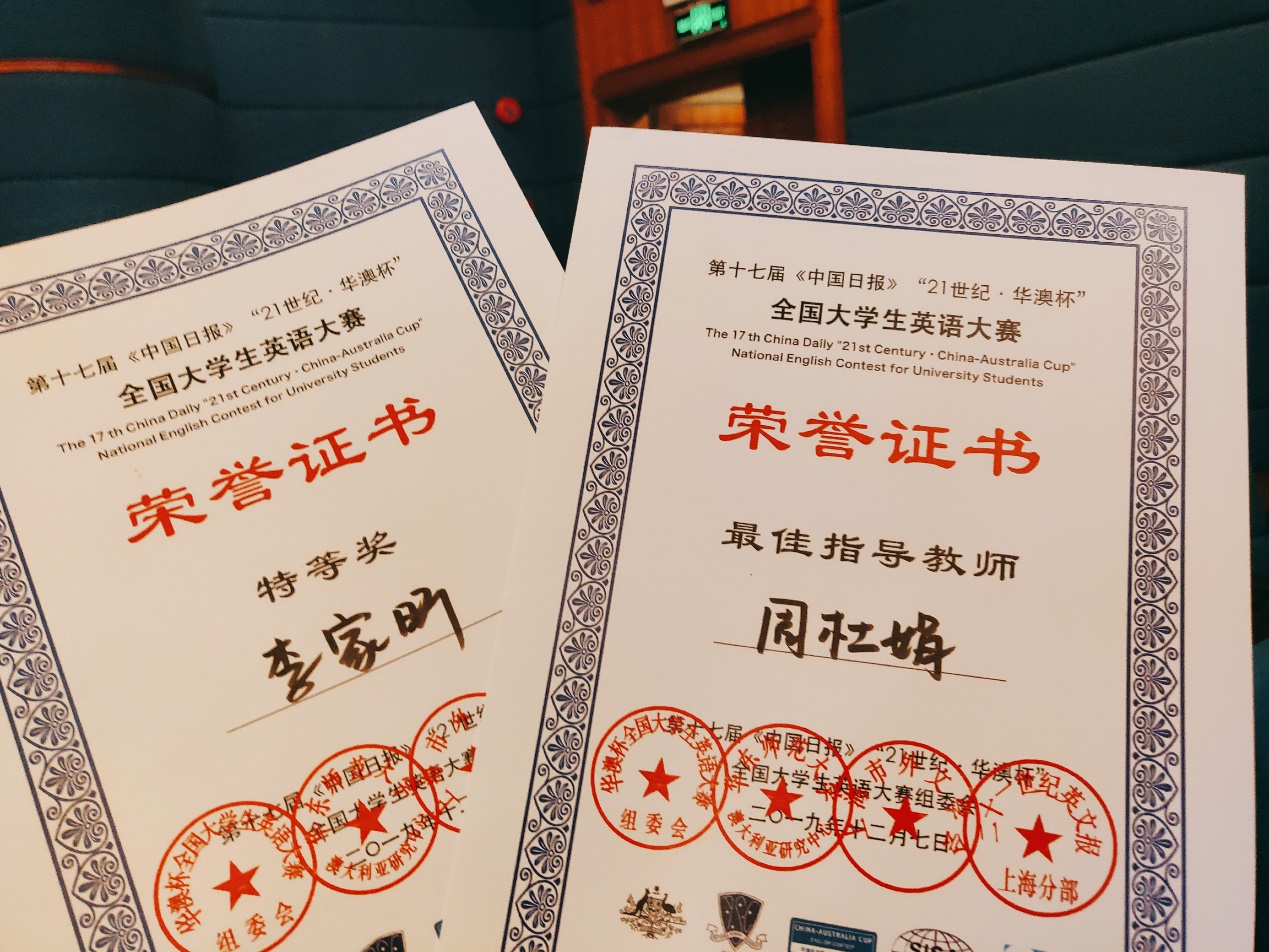 12月7日,由华东师范大学澳大利亚研究中心主办,中国日报21世纪英文报、上海市外文学会、华东理工大学澳大利亚研究中心协办的第十七届《中国日报》“21世纪·华澳杯”全国大学生英语大赛圆满落幕。我校英语学院2017级本科生李家昕在26所高校选手中脱颖而出,夺得冠军,荣获特等奖。周杜娟老师获最佳指导老师。