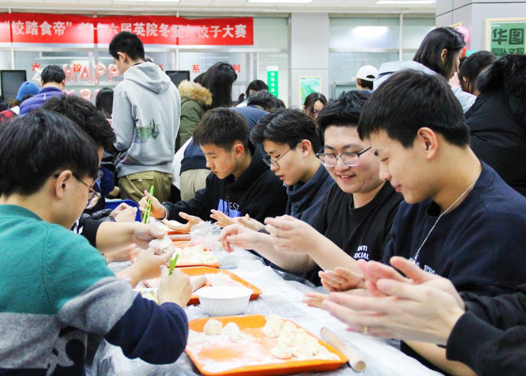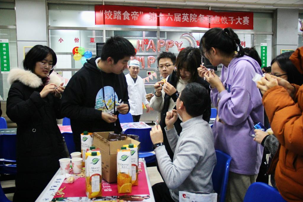 2019年12月21日下午6点,英语学院“饺踏食地”第十六届包饺子大赛在校食堂二楼成功举办。参与本次大赛的有英语学院大一全体学生,高年级本科生、研究生、预科生、台湾地区交换生代表以及主席团、部长团成员。出席本次比赛的领导老师有英语学院院长张剑、党总支书记兼副院长路兴、党总支副书记孟庆琨、副院长张莲、副院长彭萍、1903班班主任王元陆、1904班班主任邱枫、国际项目部老师李璇、史可、英语学院辅导员张春霞、英语学院研究生团总支书记王博铮以及英语学院本科生团总支书记王书剑。