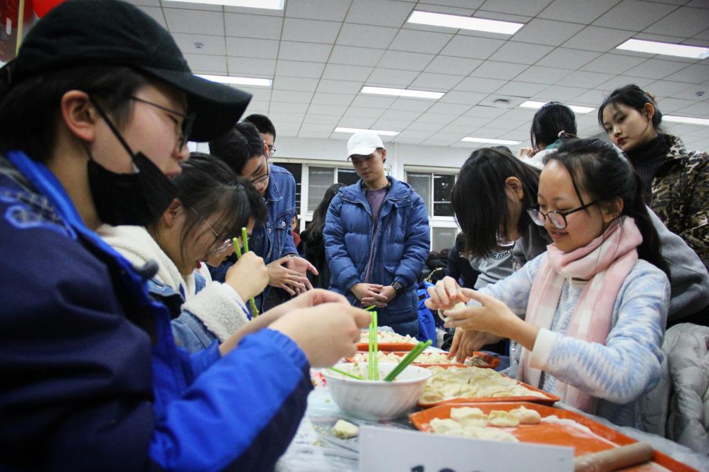 首先,张剑院长发表讲话。他对全体学生的参赛热情给予了高度评价,并表达了对全体同学的真切祝福。接着,1901班刘俐岑同学的暖场节目街舞《Worth it》点燃了全场的氛围。随后,包饺子大赛正式开始。同学们纷纷动手擀面皮、包饺子,分工明确,气氛融洽;老师们也干劲十足,和同学们打成一片,其乐融融。