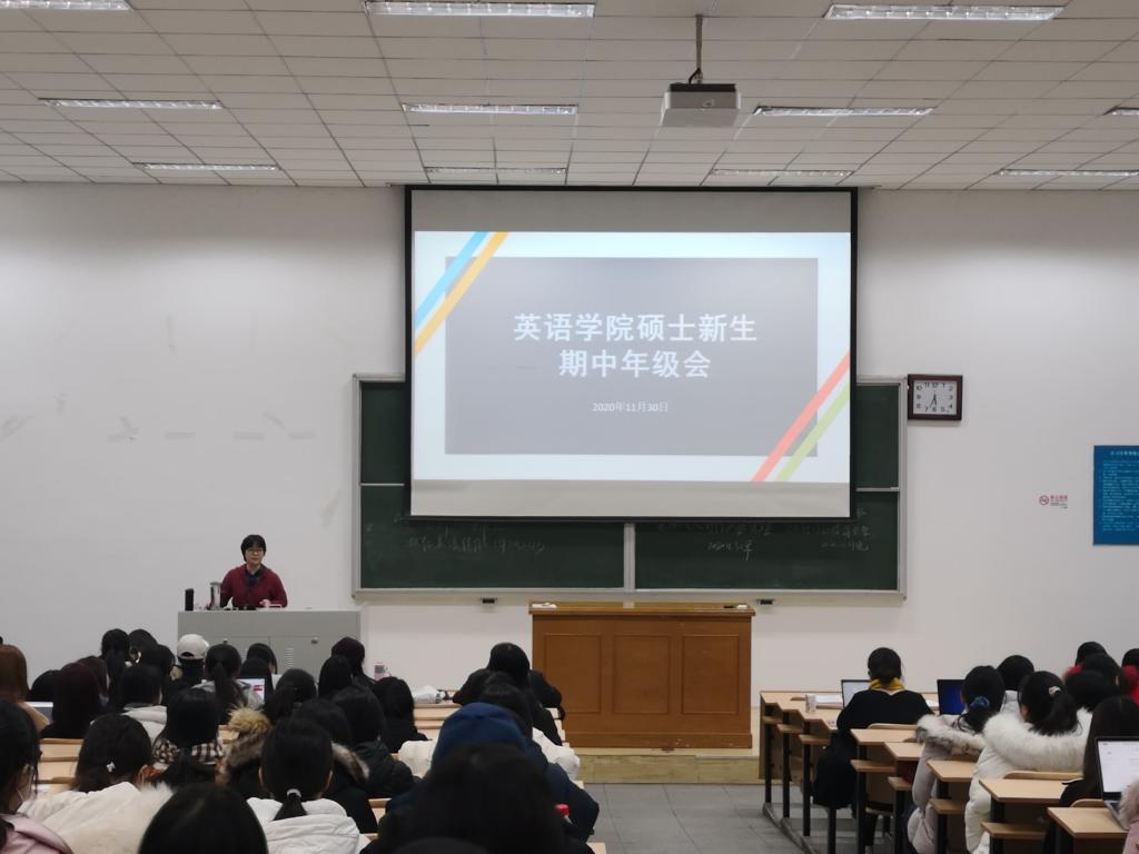 2020年11月30日晚,英语学院2020级硕士研究生学业跟进分享会暨年级会在十二大教室召开。英语学院党总支书记路兴、副院长王展鹏、辅导员王萌、2019级学长学姐代表及2020级全体研究生出席。本次会议由王萌老师主持。