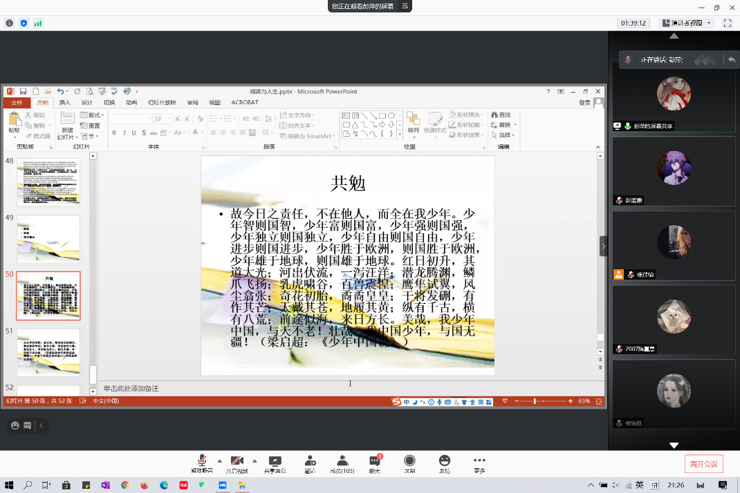 历经一个半小时后,英语学院“阅读与人生”专题讲座最终圆满落下帷幕。通过此次讲座,同学们切实感受到阅读的乐趣,同时也掌握了有效的阅读方法,对阅读与人生的关系有了进一步的思考。红日初升,其道大光。作为新时代的青年,同学们应胸怀理想,脚踏实地,笃志虚心,循序渐进,用书籍指明人生的方向,用书籍搭建梦想的阶梯。