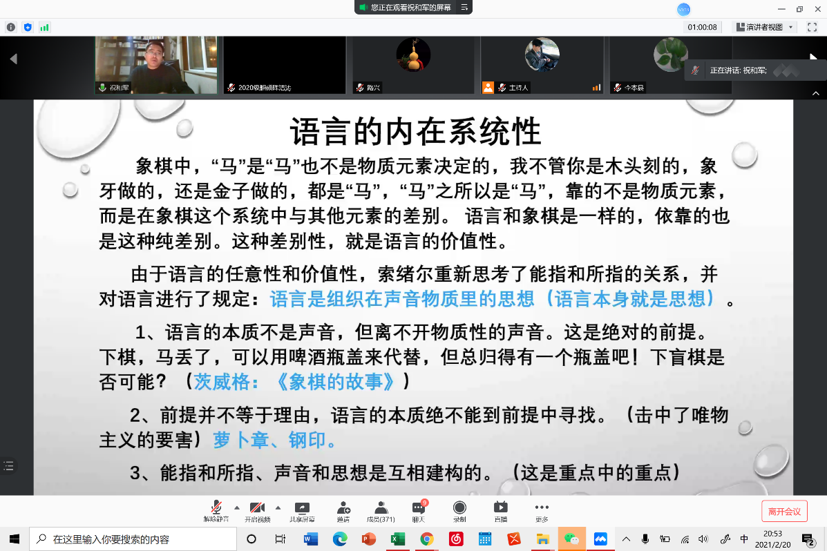 2021年2月20日晚,北京外国语大学英语学院于腾讯会议成功举办“《普通语言学教程》导读”线上讲座。本次讲座邀请到我校马克思主义学院党总支书记祝和军副教授,为同学们解读索绪尔著作《普通语言学教程》,并就语言结构和文化差异和大家展开讨论。