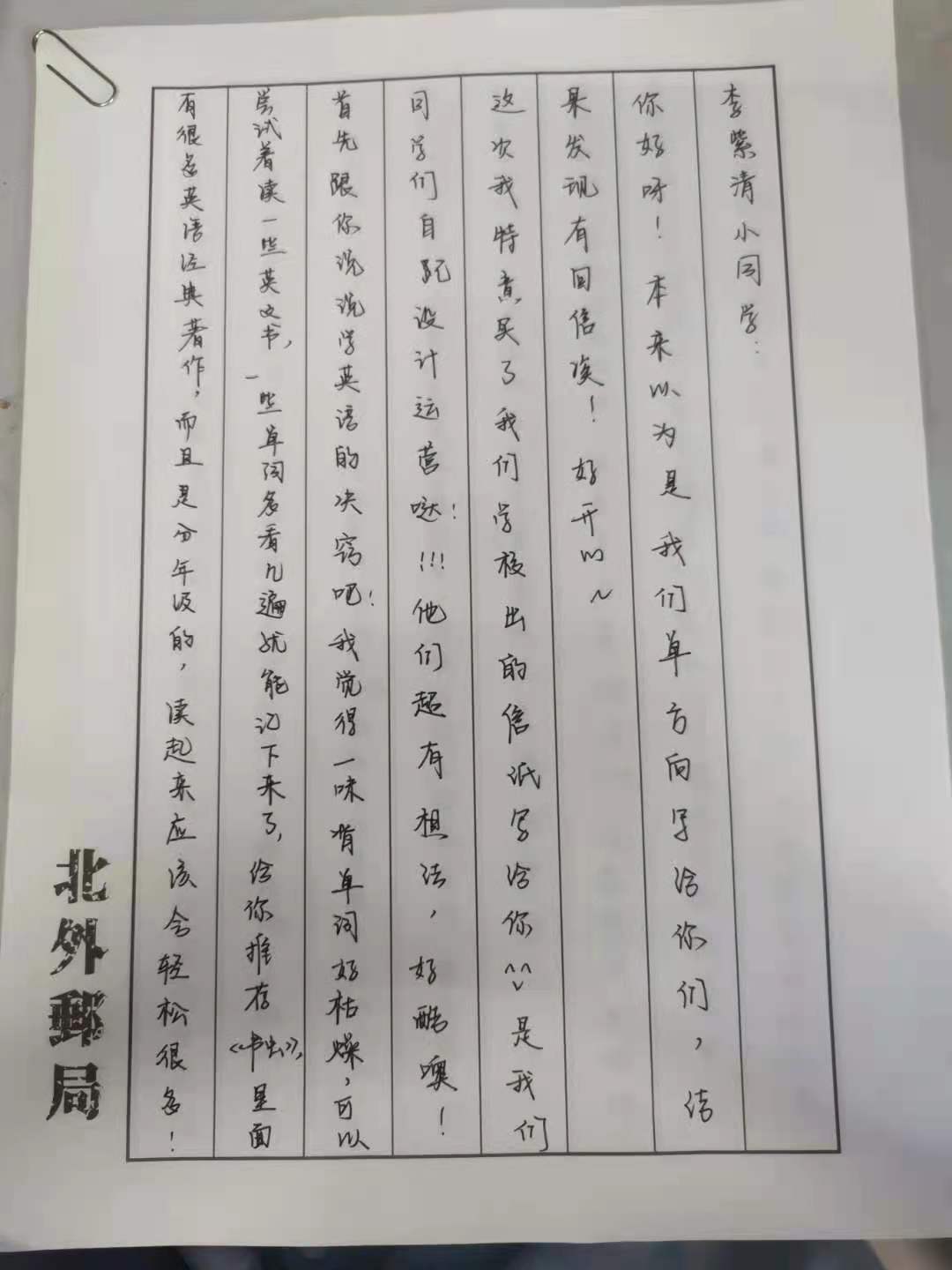 英语学院本科生低年级党支部党员王丽瑶同志表示,从前,车马邮件都慢,现在网络通讯工具太过方便,以至于少有机会提笔写下问候。这次党支部组织的写信活动让我们重拾写信的浪漫,也认识了一群可爱的小朋友们。他们积极向上,有着说不完的开心事,尽管有时候也会吐槽作业多,但是更多的还是对未来的向往,互相交流的过程中,自己的也变得更加乐观积极了。