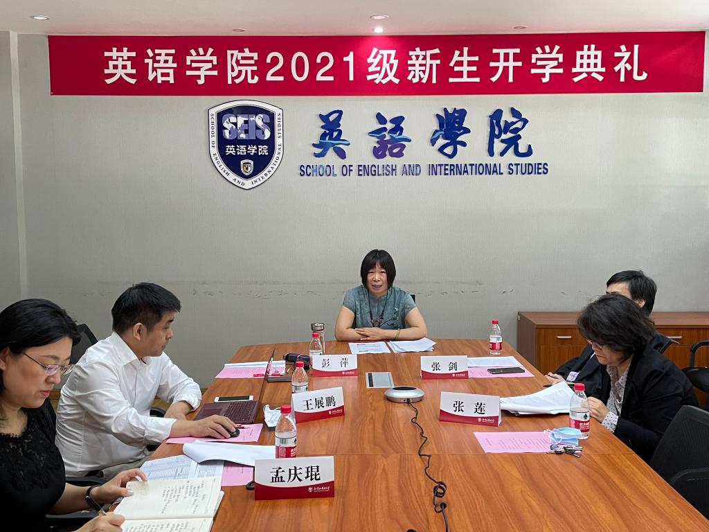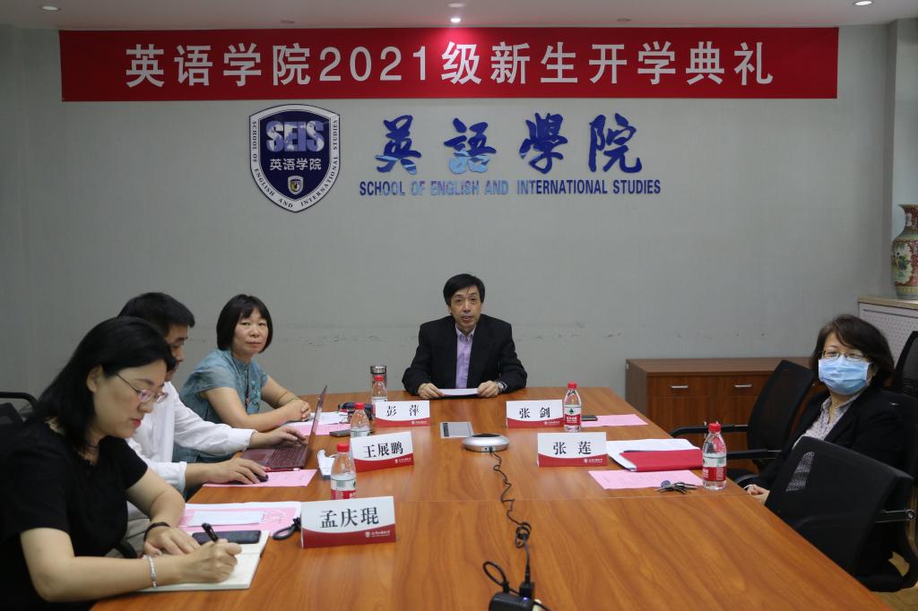 9月8日上午,英语学院通过线上、线下相结合的方式举行2021级新生开学典礼。英语学院院长张剑、副院长张莲、副院长王展鹏、副院长彭萍、党总支副书记孟庆琨、各研究中心主任、本科生班主任、辅导员以及四百余名新生共同参加典礼。