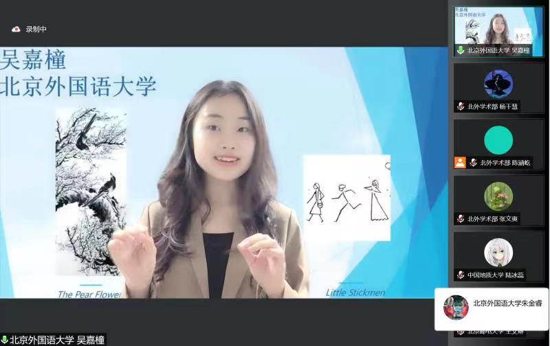 首都高校英语演讲风采大赛是教育部首个批准举办的由大学生自己策划、举办的英语演讲风采比赛,也是北外英语文化节中的重头戏之一。比赛所有题目和环节完全源自学生自己的创意与构想,真正体现了当代大学生的思想深度与广度,让大学生以自己的角度思考问题、讨论问题。本次演讲大赛通过各校分别举办初赛的形式,从所有参赛选手中选拔出19名选手,最终参与北外决赛。本次决赛采用线上方式举办,以“Life in Full Blossom Towards the Sun”为主题,选手们以演讲的方式讲述自己从不同人物战胜困难、克服挫折、追求梦想的故事中获得的感动与启示。比赛选手中,有雄辞善辩者,也有娓娓道来者,面对同一主题,选手们给出了各自不同的精彩阐释。选手们沉着冷静,在几分钟时间内全身心沉浸在自己的演讲之中,将观众带入他们的精神世界。演讲完毕后,选手们相继回答评委提问,对自己的演讲内容进行更深入的阐释,为我们带来一场精彩绝伦、引人深思的演讲比赛。最终,来自北京科技大学的张川慧子获得第一名,北京外国语大学的吴嘉橦获得第二名,北京林业大学的李怡帆获得第三名。