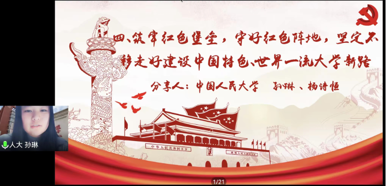 学习分享会上,北京大学、北京师范大学、中国人民大学、中国政法大学四个党支部分别分享了习近平总书记视察各自学校的重要讲话精神与学习心得体会。北京外国语大学党支部分享了学习贯彻习近平总书记在庆祝共青团成立100周年大会上的重要讲话精神。