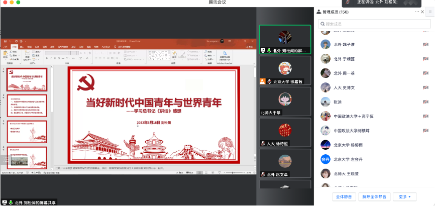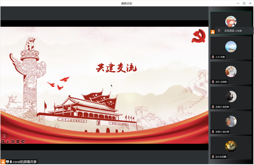 在当前疫情防控形势严峻的情况下,为持续推进英院学子理论学习走深走实。5月18日晚19点,北京外国语大学英语学院本科生党支部与北京大学2021级法律硕士(非法学)第四党支部、中国人民大学法学院2021级法律硕士二支部、北京师范大学法学院2021级法硕第二党支部、中国政法大学证据科学研究院2021级司法文明硕士党支部联合开展“青春心向党,强国有担当”主题党日活动。