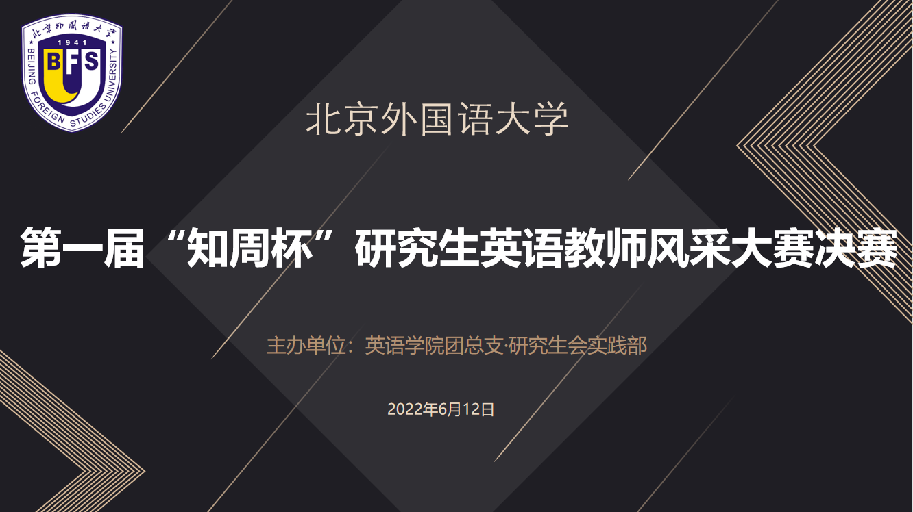 2022年6月12日上午,第一届“知周杯”研究生英语教师风采大赛决赛成功举办。本次大赛由北京外国语大学英语学院研究生团总支主办,英语学院团总支研究生会实践部承办。北京外国语大学英语学院党支部书记王明欣出席本次活动。北京外国语大学英语学院林岩教授、中国外语与教育研究中心徐浩研究员担任决赛评委老师。