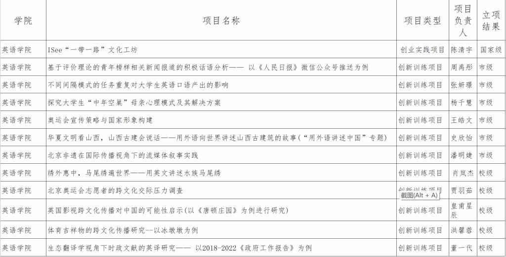 根据《关于2022年大学生创新创业训练计划项目立项工作的通知》要求,2022年英语学院共申报立项项目23个,经过材料审核,专家评审,项目陈述等环节,共确定国家级项目1个,市级项目6个,校级项目5个。