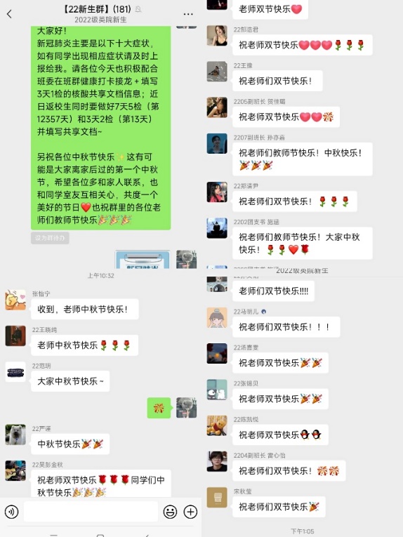 辅导员老师们也在各自分管的年级群为同学们送上中秋祝福,并为在健康观测点的学生送去中秋月饼。党总支副书记孟庆琨召开年级班委线上会议,与学生们沟通交流并送上节日祝福。
