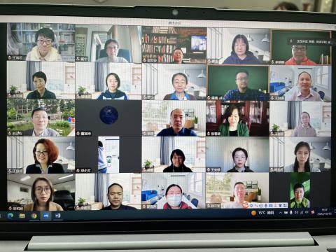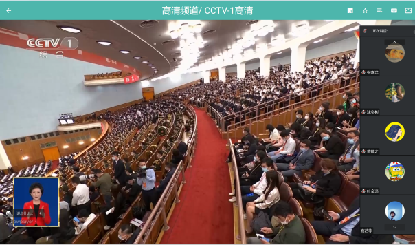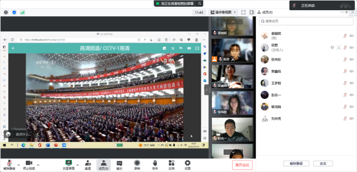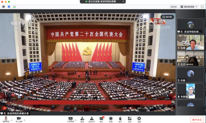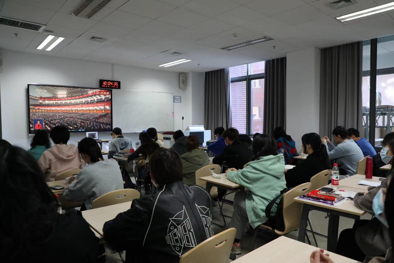 在英语学院会议室,领导班子成员和师生代表共同观看直播。按照学校安排,党总支书记和院长在晨读厅主会场观看直播,60名学生代表在千人礼堂观看直播。全体教师和本科生、研究生、预科生在线观看直播。