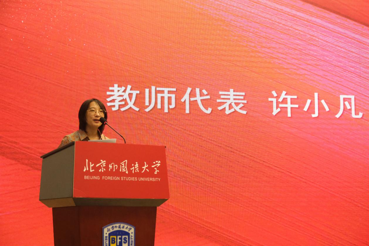 教师代表许小凡老师回忆了自己在北外的往昔点滴,并祝愿大家能够从英语学院收获温暖的回忆和光明的未来。许小凡老师提出,在如今这个机器快速进步的时代,英语这样的学科愈发珍贵,因为大学不仅培养“术”与技能,也有“道”的教育,希望大家在这里既能达到对英语学习的深层理解,也能迎接科技进步的挑战,不仅满足于字面的雕琢,更能深入文化内部,寻求不同心灵的共振。