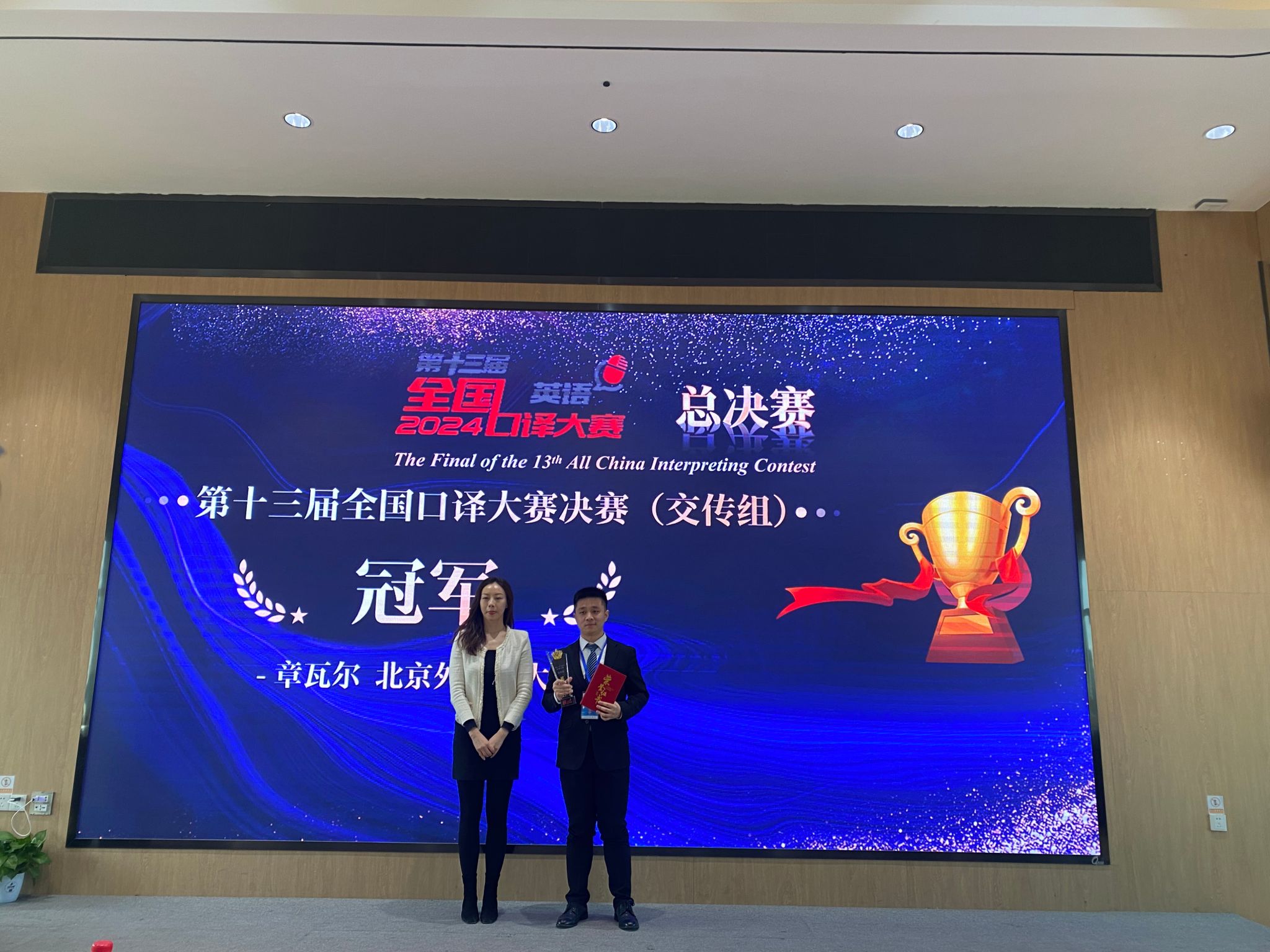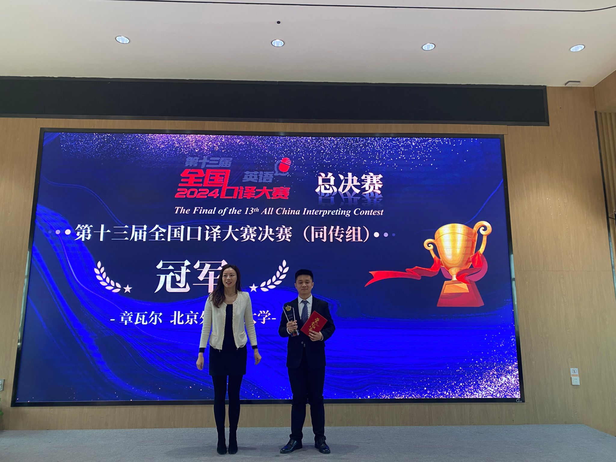 大赛共有来自全国527所高校的近8000名参赛选手参赛,经过多轮角逐,107位和24位优秀选手脱颖而出分别进入交传、同传总决赛。北京外国语大学英语学院参赛学生实力强劲,展现出扎实的语言功底和优秀的专业水准,包揽同传、交传两个赛项冠军及全国一等奖五项、二等奖一项。多名同学跻身精英十强。
