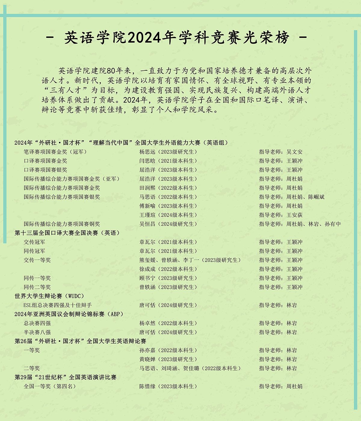 英语学院建院80年来,始终致力于为党和国家培养德才兼备的高层次外语人才。2024年,英语学院学子在全国性及国际性的口笔译、辩论、演讲等大赛中屡创佳绩,充分彰显个人风采与学院育人成果。新学期初,为弘扬榜样力量、激励全院师生,英语学院在学院大厅张贴2024年学科竞赛光荣榜,集中展示本年度取得的优异成绩。
