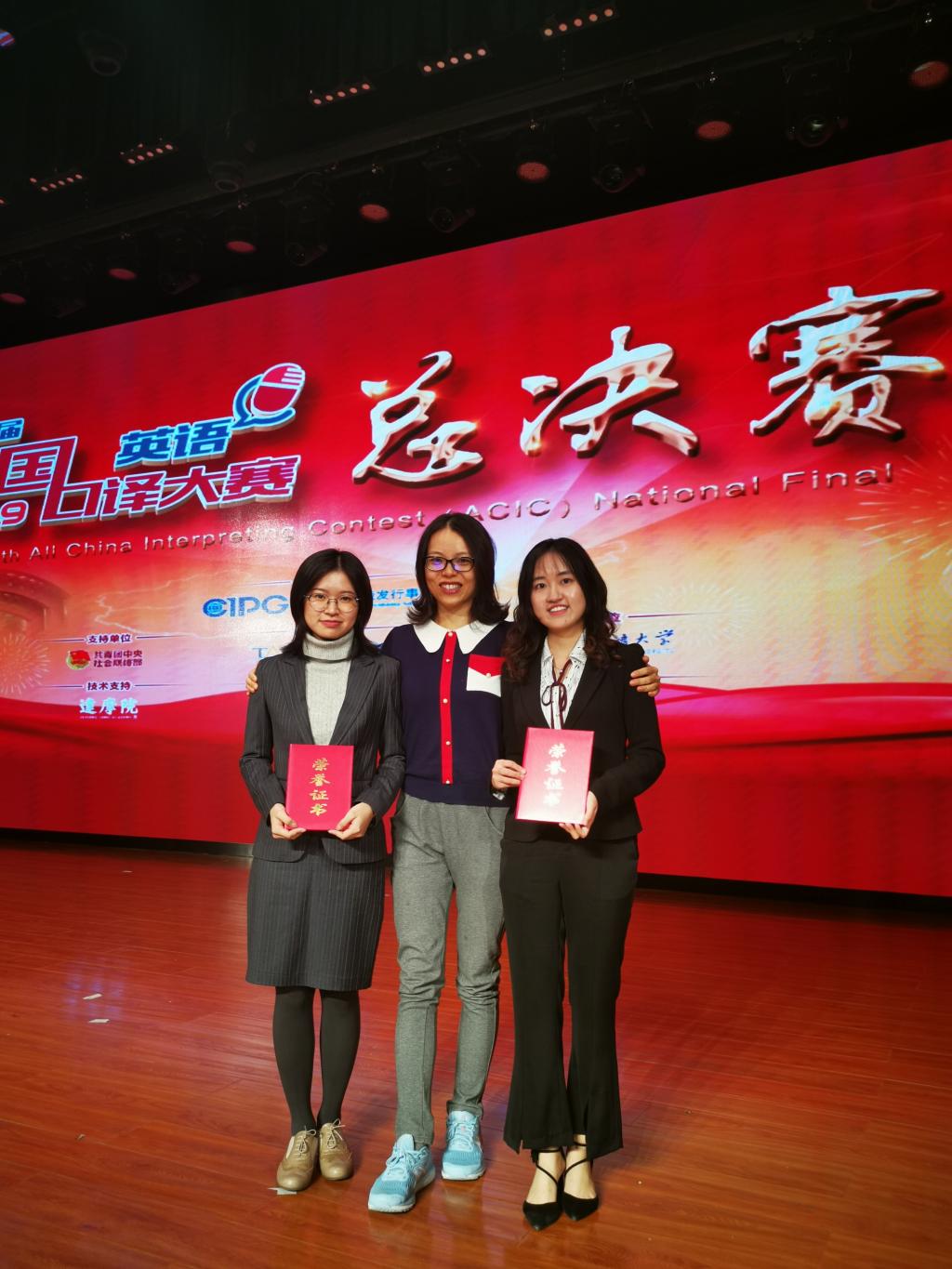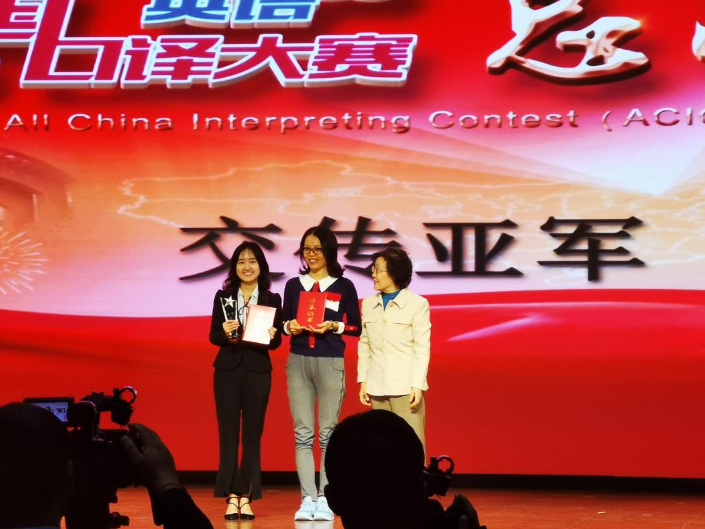 第八届全国口译大赛(英语)总决赛于2019年10月18日至19日在北京外国语大学千人礼堂举行。经过两天的激烈角逐,我院学子取得优秀成绩。其中,金羽菲同学获交传亚军、同传邀请赛二等奖,尹佩璇同学获交传二等奖,侯玉颖同学获交传三等奖,王颖冲老师获优秀指导教师奖。英语学院毕业生、口译俱乐部队员王静怡获得交传冠军和同传季军。