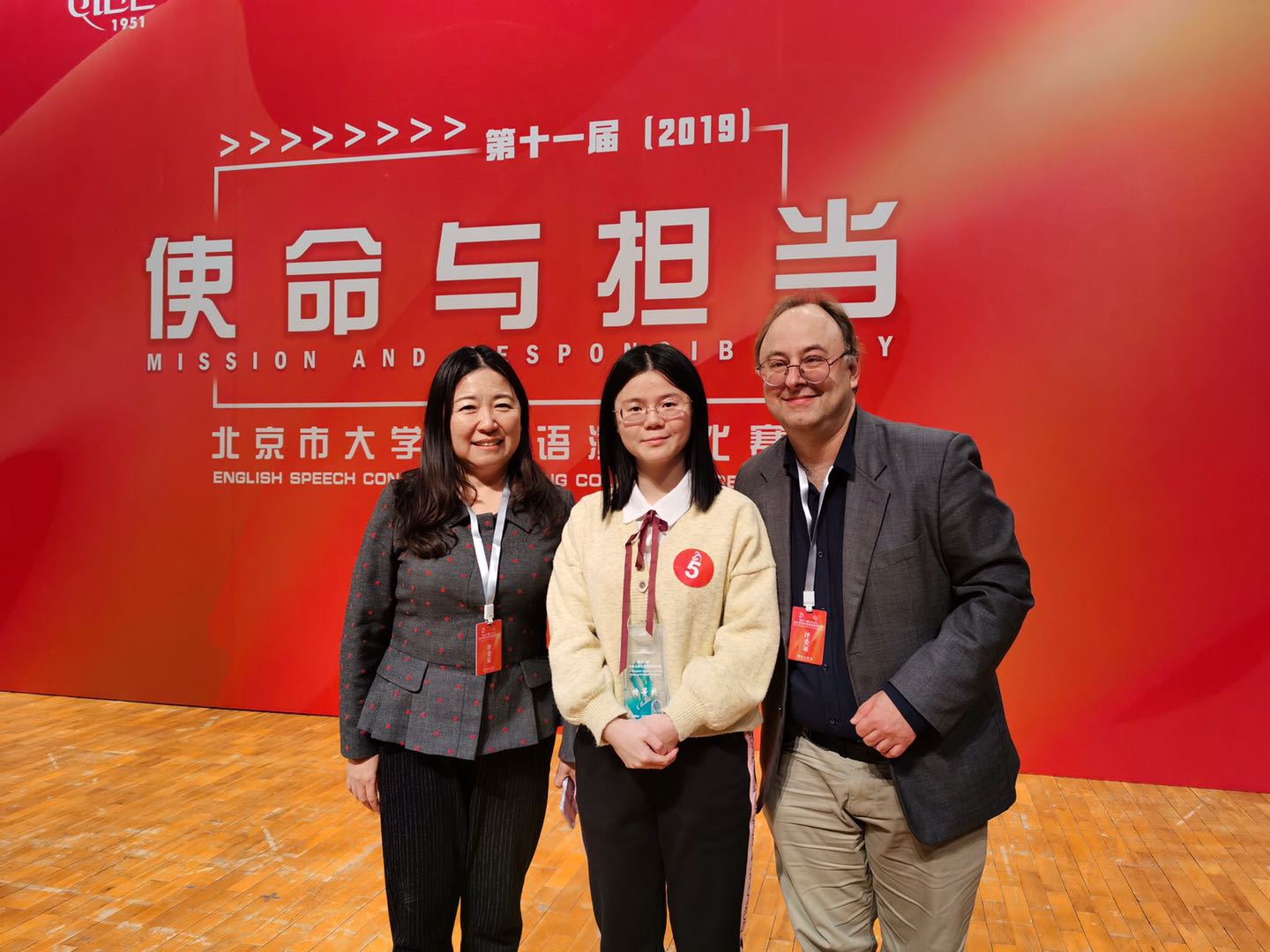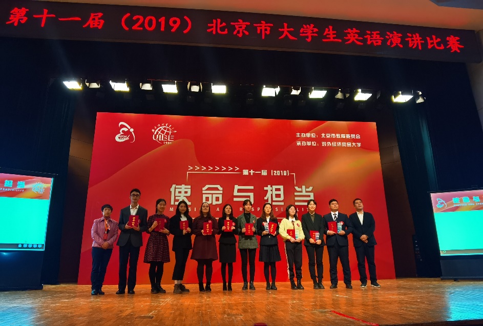 11月30日,由北京市教育委员会主办、对外经济贸易大学承办的第十一届(2019)北京市大学生英语演讲比赛圆满落幕,我校英语学院大一学生卢洁杀进决赛并荣获特等奖。本届大赛的主题是“使命与担当”,来自六十所北京高校的六十名选手同台竞技,以自己的演讲为媒介从不同角度阐释和传播新时代青年的“使命与担当”。我校选手卢洁复赛阶段尽管排位比较靠前不算太理想,但她仍以95.4分的高分位列小组第一出线进入了决赛。在决赛阶段,她沉着应战,凭借扎实的基本功和出色的发挥再次以94.21的高分拔得头筹,获得该项比赛特等奖。祝贺卢洁在此赛事中取得的优异成绩,同时也感谢英院指导老师周杜娟、龚雁老师以及英院演讲队成员们的辛勤付出。