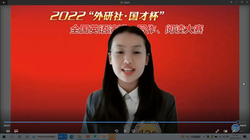 12月11日,2022“外研社·国才杯”全国英语演讲大赛全国决赛圆满落幕,我校英语学院2022级徐成成同学斩获冠军。此前,她通过校选赛和北京赛区两轮考验,以北京赛区第一名的成绩获得参加全国赛的资格。