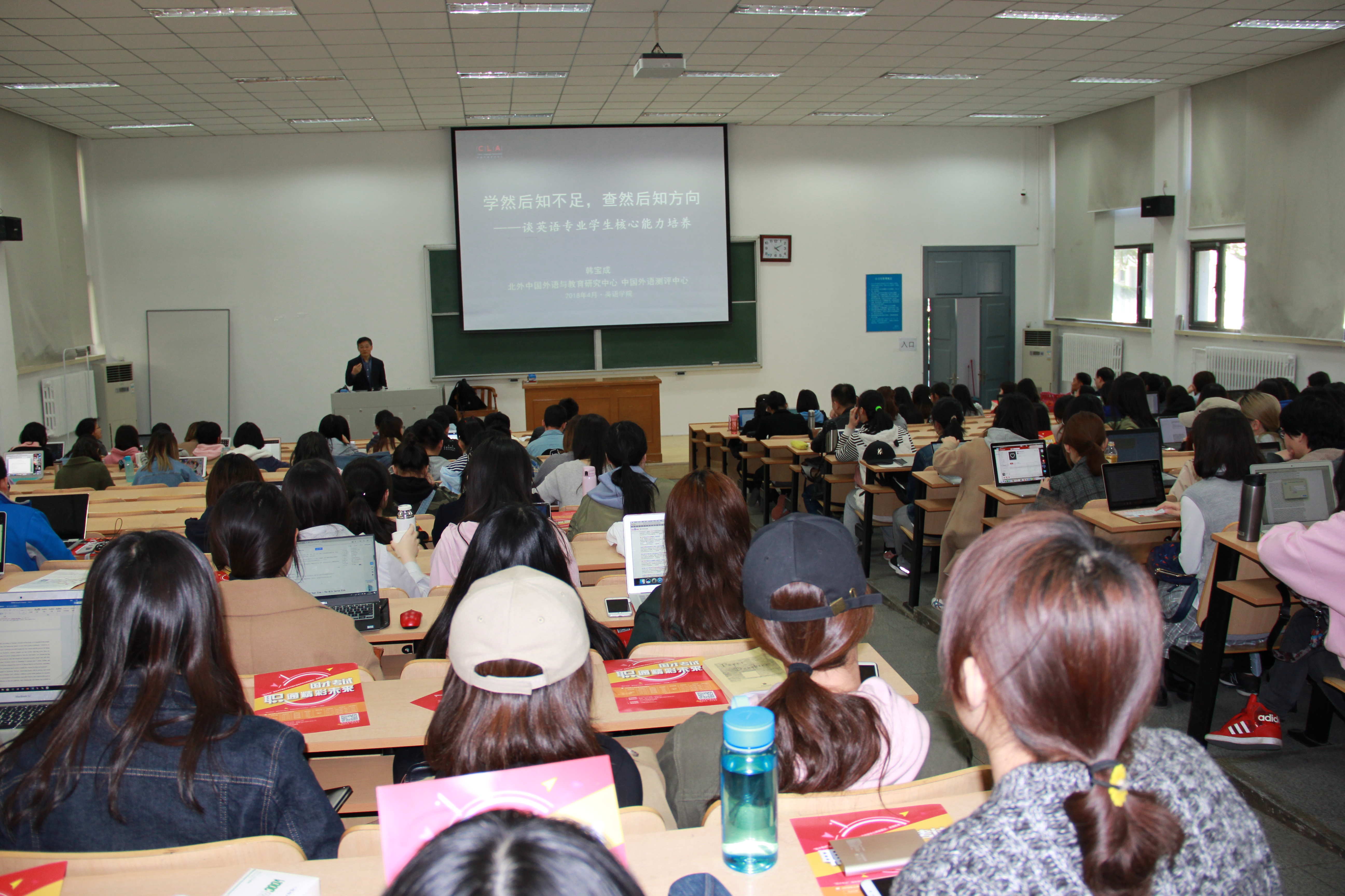 ——4月10日下午4:00,我校十二大教室,英语学院邀请了我校外语教育与研究中心副主任、外国语言研究所副所长、中国外语测评中心副主任韩宝成教授为学生们做了“学然后知不足,查然后知方向:谈英语专业学生核心能力培养”的学术讲座。英语学院副院长张莲教授主持讲座,辅导员张春霞组织协调。