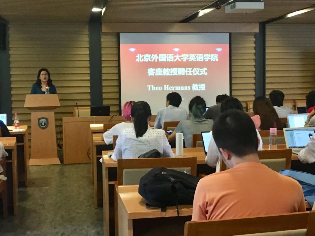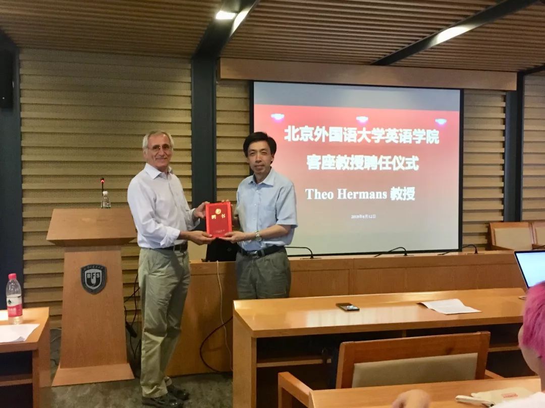 ——6月12日下午,国际知名翻译理论家提奥•赫曼斯(Theo Hermans)教授受聘北京外国语大学英语学院客座教授仪式在图书馆三层报告厅举行。受聘仪式由翻译研究中心主任马会娟教授主持。
