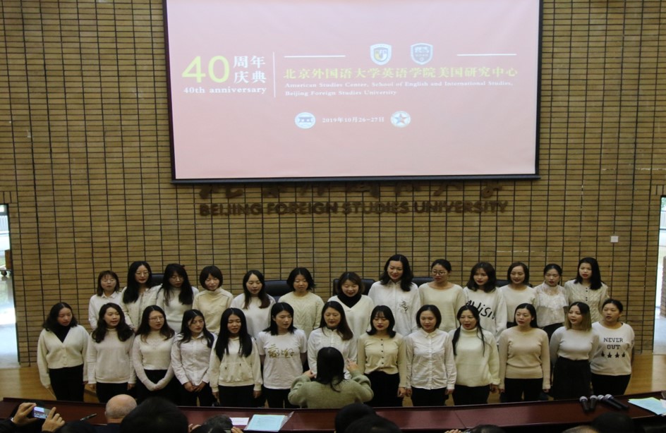 庆典在美研中心硕士生合唱的“故乡的亲人”的优美曲调中拉开序幕,美国研究中心主任付美榕教授主持了开幕式。北京外国语大学副校长孙有中教授通过视频首先致辞。他充分肯定了美国研究中心四十来在学科建设与人才培养方面取得的长足进步,同时激励美研中心抓住新的发展机遇,努力进取、再创辉煌。英语学院院长张剑教授代表英语学院致辞。他向不同时期担任美国研究中心主任的邓炎昌教授、朱永涛教授、梅仁毅教授,以及和他们同舟共济的杨立民教授、吴青教授、林克美教授、张毓霖教授、陆培敏教授、吴冰教授、王立礼教授等诸位前辈表示深深的敬意,并向曾经在美国研究中心任教的Helen Young教授,、John Blair教授、王心扬教授、金莉教授等30多位外籍专家、富布莱特学者、客座教授和兼职教授表示诚挚的谢意。张剑院长还强调指出,随着中国“一带一路”战略的展开,区域与国别研究受到高度重视,外语学科框架下区域国别研究人才的培养得到众多高校的青睐,也面临诸多挑战。他衷心希望,美国研究中心能够在付美榕教授的带领下秉承传统、继续开拓,为英语学院的国别研究人才培养、学术研究、对外交流做出更大的成绩。开幕式的另一项内容是颁奖礼。英语学院路兴书记和张剑院长为美国研究中心荣休教授--邓炎昌、朱永涛、梅仁毅、杨立民、吴青、林克美、张毓霖、陆培敏教授以及客座教授王心扬教授颁发了“美国研究中心人才培养特殊贡献奖”奖牌,同时为中美教育基金(US-China Education Trust)主席张之香(Julia Chang Bloch)女士颁发了“美国研究中心发展特殊贡献奖” 奖牌。颁奖礼上还播放了美国研究中心创始人、96岁的邓炎昌教授从美国亚利桑那州发来的问候,以及1980年代至1990年代初在美国研究中心任教的美国教授Helen Young 女士的寄语。