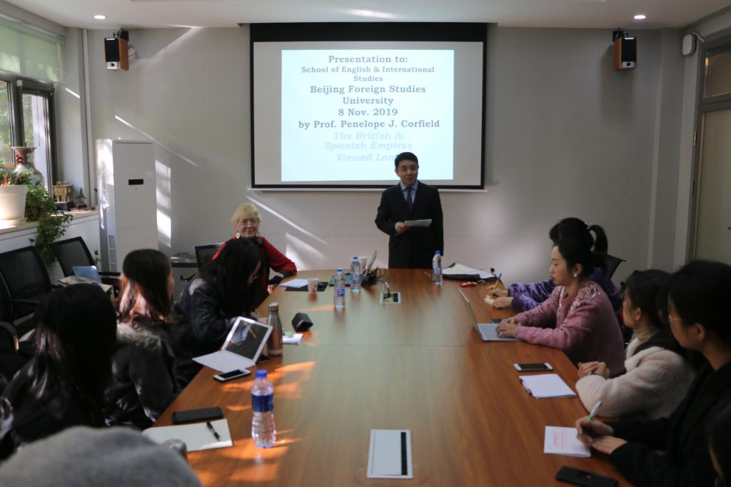 2019年11月8日上午,英国18世纪研究会主席、国际18世纪研究会副主席、伦敦大学皇家霍洛威学院教授Penelope Corfield女士访问英语学院英国研究中心、爱尔兰研究中心并以 “西班牙帝国和大英帝国兴衰的长时段历史考察”为题面向英语学院师生做了学术讲座。英语学院副院长、英国研究中心、爱尔兰研究中心主任王展鹏主持讲座并就有关合作进行了讨论。