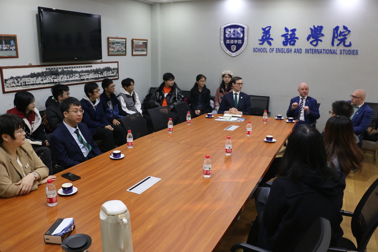 都柏林大学代表团还与英语学院预科班学生进行了座谈。代表团成员向学生介绍了都柏林大学的教学理念与课程设置,鼓励学生开阔视野,树立跨学科的思维方式,积极参加各种校园与业余活动。代表团还回答了学生在都柏林大学学习与生活的相关问题。