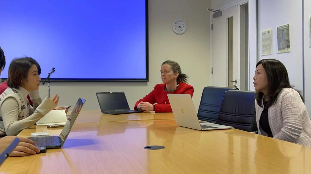 随后实践团一行与科克大学国际处负责人进行座谈,科克大学北京代表处主任张蓓、副主任李鹏出席本次座谈会。科克大学国际处负责人对科克大学优势学科建设、师资力量、就业前景等本硕联合培养项目的相关情况进行了介绍,她表示希望与北京外国语大学在学术交流、联合办学等方面进行更多的合作。科克大学北京代表处的老师也表示,北外拥有丰富的外语资源优势,希望双方以此次座谈为契机,在暑期交流,海外实践等方面进行合作。最后张珺涵老师对英语学院的办学历史,学科建设,课程设置等进行介绍,就未来双方在留学交换,暑期实践等多方面合作进行商议,为之后双方合作交流打下坚实基础。