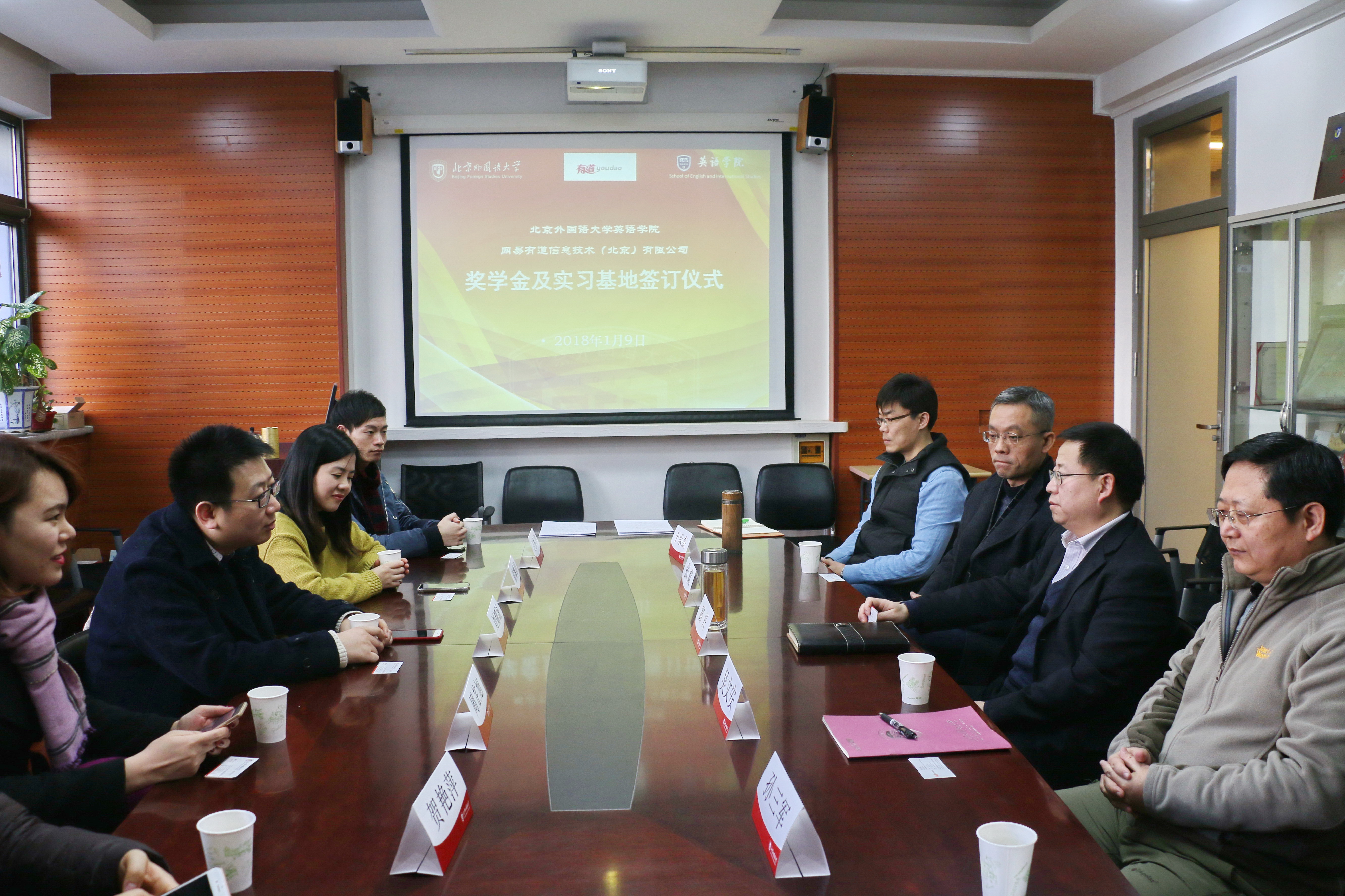 ——1月9日下午,网易有道信息技术(北京)有限公司与英语学院签署“有道翻译奖学金”及北京外国语大学网易有道翻译实践实习基地协议。有道副总裁刘韧磊,人工翻译总经理谢婵娟,教育战略合作总监周芷旭,公关经理贺艳萍,市场经理赵振华出席仪式。英语学院党总支书记路兴,翻译系主任张威,翻译系副主任吴文安,MTI中心主任孙三军及辅导员于承杰参加。