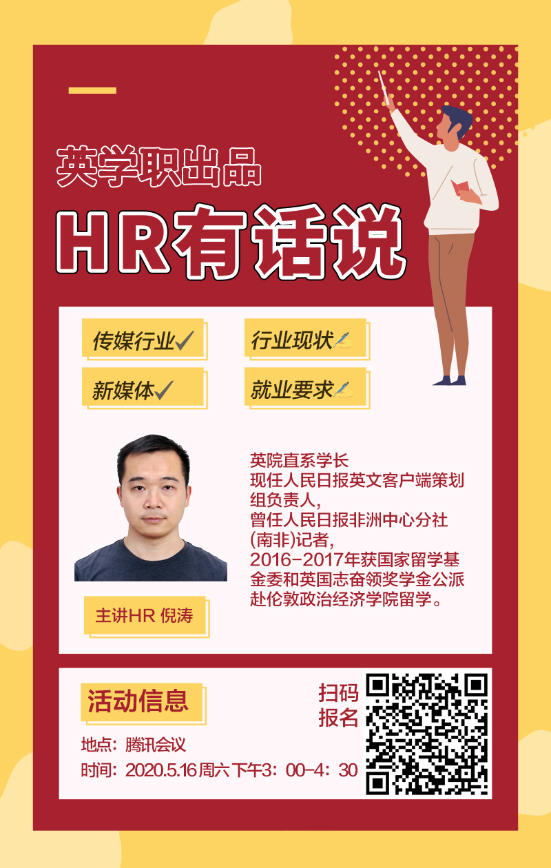 、现任人民日报英文客户端策划组负责人的倪涛学长,担任“HR有话说”栏目第四期活动的主讲嘉宾。倪涛学长曾任人民日报(位于南非)的非洲中心分社记者,有过从传统媒体转向新媒体的经验,也曾参与过单位的招聘。学长在活动中为我们分享了他的从业经历和求职经验,令同学们获益匪浅。